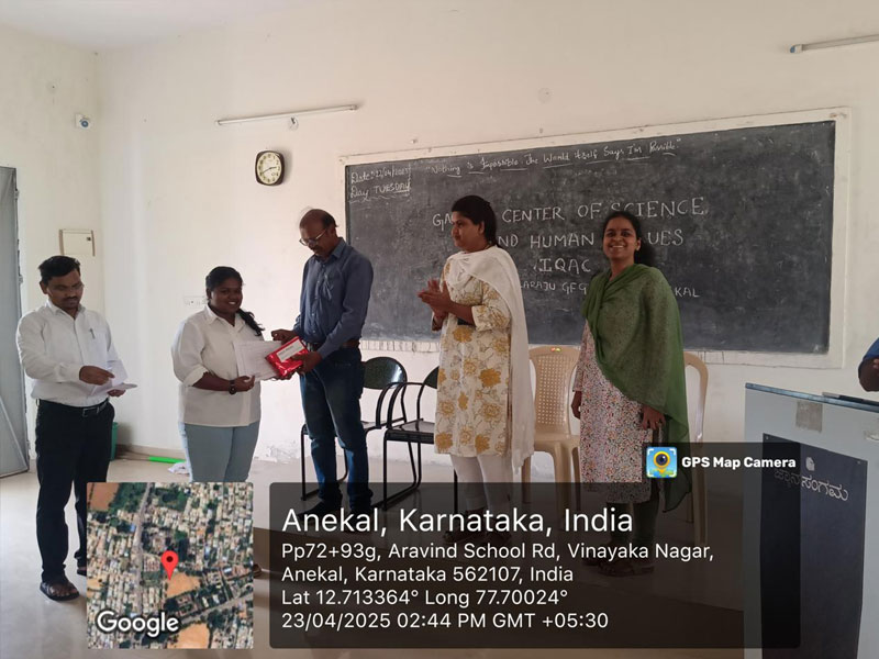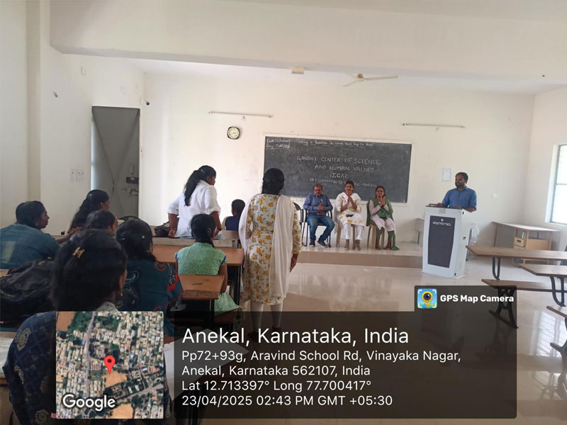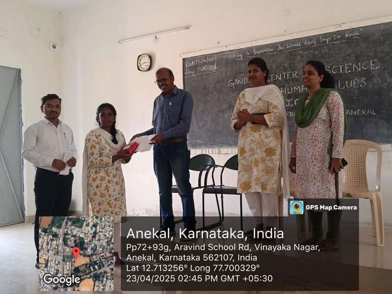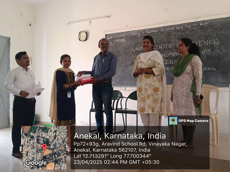 An Elocution Competition was conducted at Dr. S.Gopalaraju Govt. First Grade College, Anekal to mark World Earth Day, on 16-4-25 on the topic “Change the Life Style, Save The Earth”. 34 students from BA, B.Com and BBA courses participated in the competition. Dr. M.B.Shekar, and Ms.L.Nandhini two faculty members were the judges. Dr. Chetan.J. coordinated the event. The prize distribution ceremony was held on World Earth Day , 22-4-25. Prof. Ramakrishna, Principal of the college presided-over the function and distributed the prizes sent by Gandhi Centre. Ms. Triveni Gandhi.C, Ms. Arunakumari.K, and Ms. Anjali.S, got the First, Second and Third prizes respectively. Around 50-60 students participated in the earth day celebration.